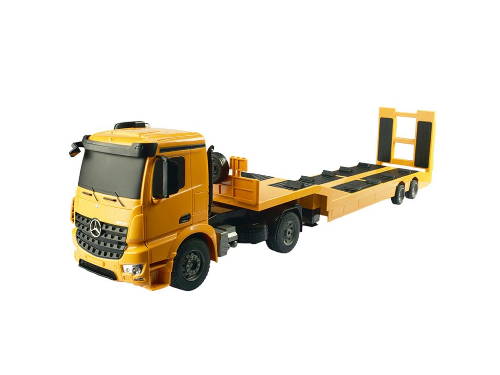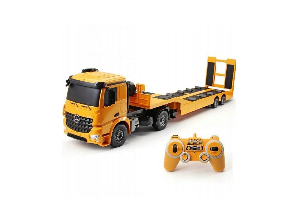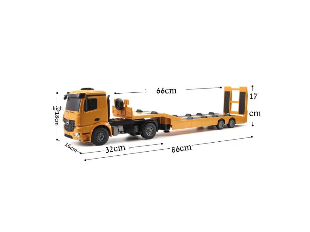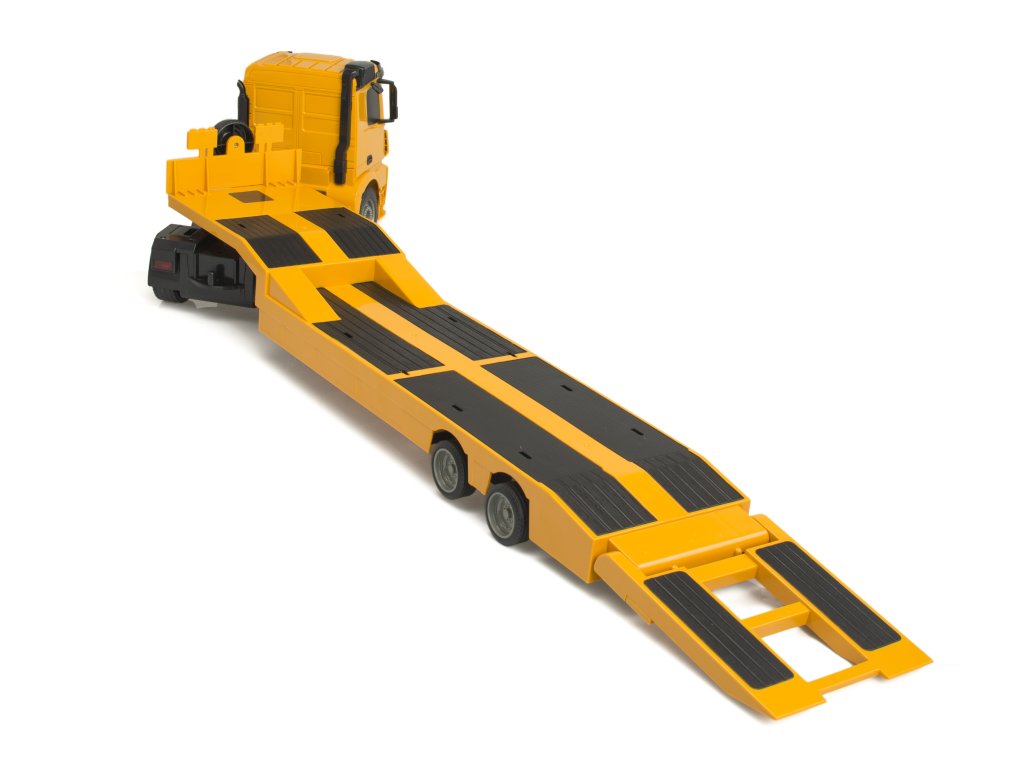 Pomocník na každou stavbu pro převoz těžké techniky. Model je určen pro vnitřní i venkovní použití. Model je osazen efektním LED osvětlením včetně funkčních majáků, a zvukovým modulem s realistickým projevem. Vysílačem lze ovládat jízdu, zatáčení, dále sklápění a vyklápění nájezdů, vysunutí parkovacích opěrných nožiček, a dokonce i odpojení návěsu! Model má dvě rychlosti jízdy a také houkačku.