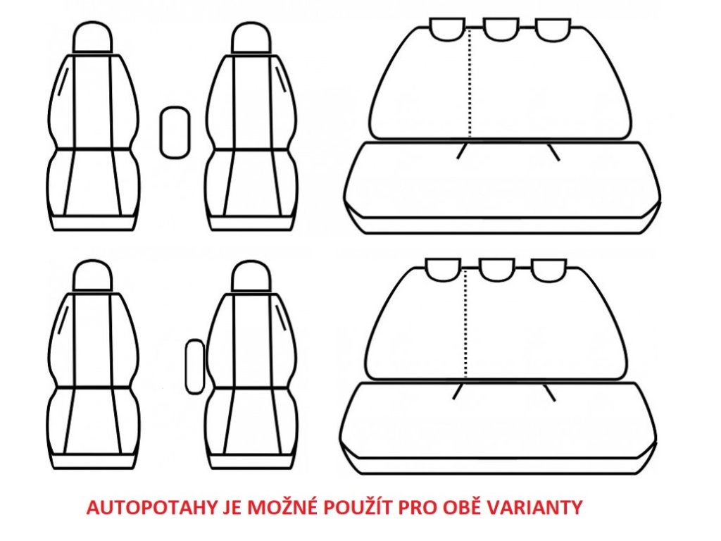 VYROBENO v EU. NOVINKA NA TRHU - ZAVÁDĚCÍ CENA! Silné polstrování, laminovaná spodní vrstva textilního materiálu. Potahy lze prát na 30°, velmi snadná montáž. Autopotahy dokonale pasují i na anatomicky tvarovaných sedadlech, a laminace autopotahy zpevňuje a zabraňuje sklouzávání potahů ze sedadel. Sada autopotahů na celé auto včetně povlaků hlavových opěrek. Vhodné pro auta s bočními airbagy, ale lze použít i pro auto, které boční airbag nemá (speciální šev). Zboží je atestováno - ATEST 8SD.