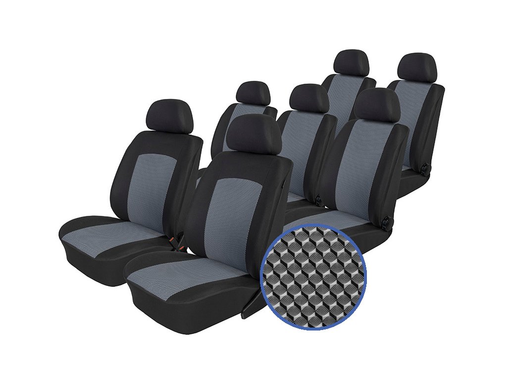 Přední opěradla s kapsami, příprava pod stolky, potahy na přední loketní opěrky. Vzadu 5 samostatných sedaček se všemi potřebnými otvory, 7 opěrek hlavy, přídavná kapsička na drobnosti v sedadle řidiče.