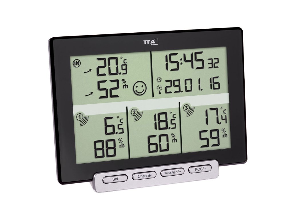 Součástí přístroje jsou již v základní výbavě 3 čidla (TFA 30.3221.02). Přístroj nadále disponuje funkcemi jako je paměť na minimální/maximální naměřené veličiny, symbolová indikace vlhkostní pohody (sucho, komfort, vlhko) a vývoje vnitřní teploty/vlhkosti (klesá, stoupá, nemění se).