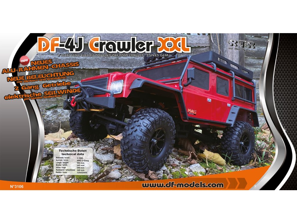DF-4J XXL Crawler je nyní vybaven již v základu hliníkovými výztuhami pro maximální pevnost. Oproti předchůdci má také ve standardu směrová a brzdová světla. Dále je vybaven stejnosměrným 60-ti závitovým motorem a s vysokým točivým momentem. Model má super měkké pneumatiky, díky kterým perfektně doslova obejme každou překážku. Diferenciály modelu jsou uzavřené a speciální elektronický regulátor typu crawler, má funkci zastavení při sjíždění ze svahu. Úhel nájezdu na překážku je až 90%, v závislosti na terénu. Elektronika je v modelu chráněna proti stříkající vodě, takže vlhkost není problém. Pevné nápravy, hliníkový rám, extrémní odpružení a mnohem více nabízejí nové modely řady DF-4J XXL! Vstupte do velkého světa "pomalých" vozidel! Model lze vylepšit řadou dalších vychytávek, jako je řízení všech čtyř kol, či tuningovými ALU hliníkovými díly. S modelem lze dosáhnout doby jízdy přes 60 minut. Převodové stupně (řazení) lze ovládat z vysílače. Vysílač má možnost díky funkci dual rate nastavit maximální rychlost 0-100%.