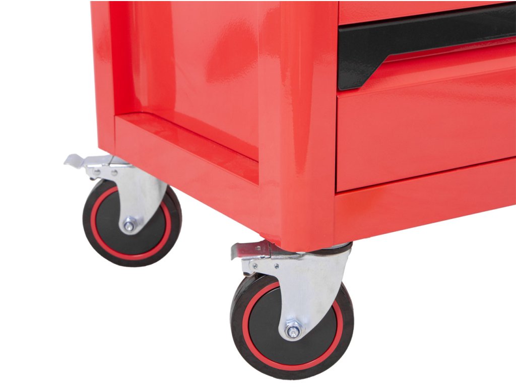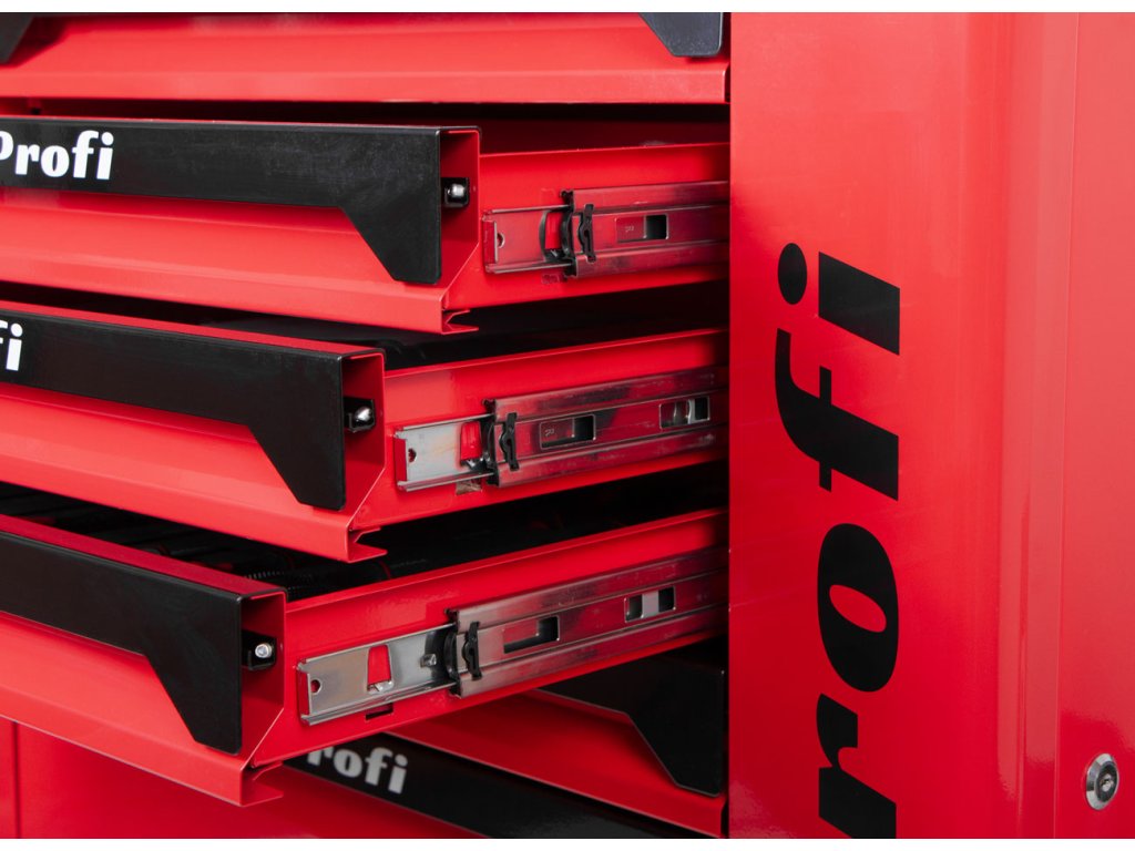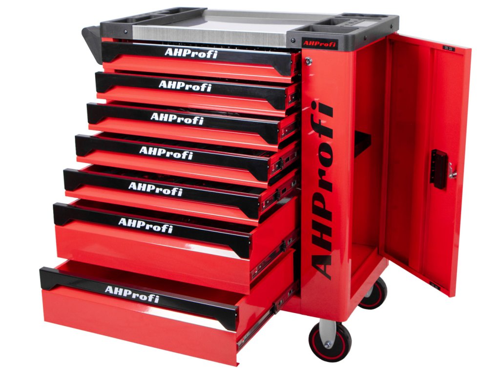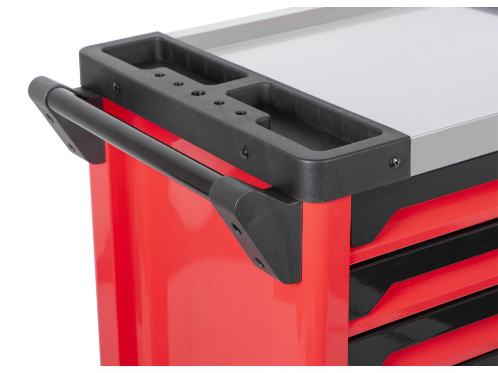 Mobilní celokovová konstrukce zajišťuje vysokou nosnost a dlouhou životnost. Vozík má 7 zásuvek s kuličkovými pojezdy pro hladké vysouvání.