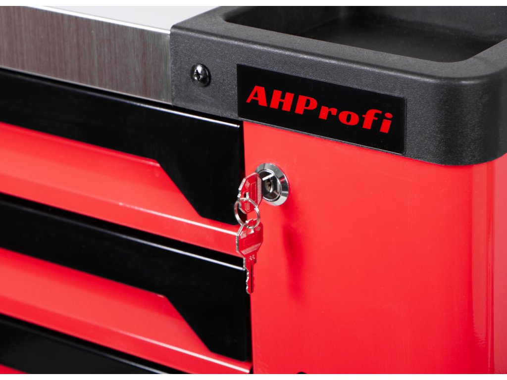 Součástí výbavy je boční uzamykatelná skříňka s poličkou, centrální zamykání zásuvek a madlo pro snadnou manipulaci.