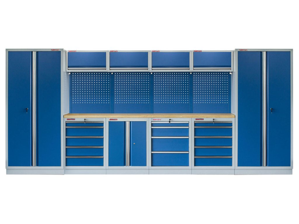 Sestava dílenského nábytku ve vysoké kvalitě, který je vhodný pro profesionální servisy i domácí garáže a dílny. Nábytek je celokovový s dřevěnou pracovní deskou. Sestava 21 ks dílenského nábytku udrží nářadí přehledně uklizené na správném místě.