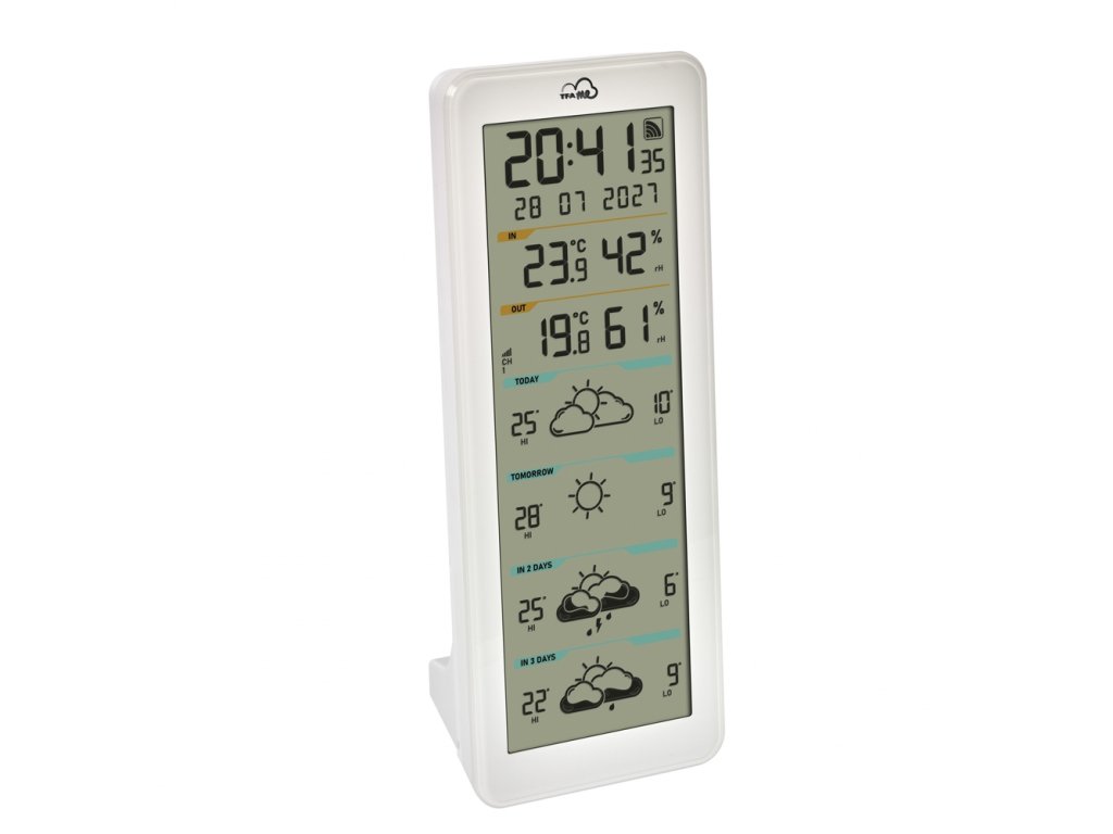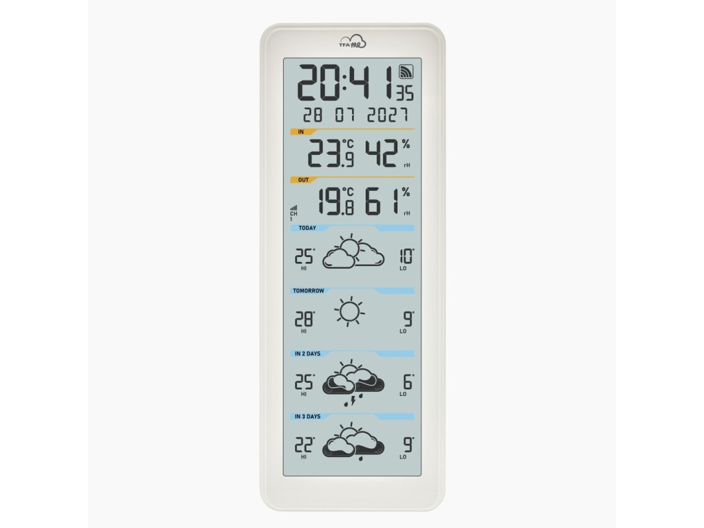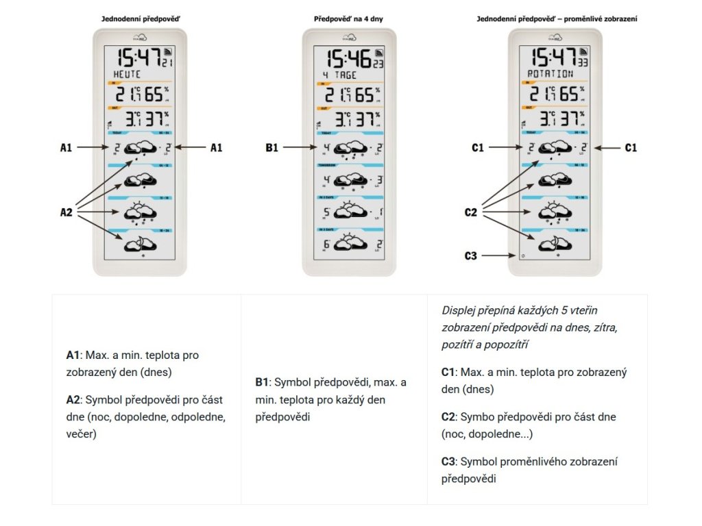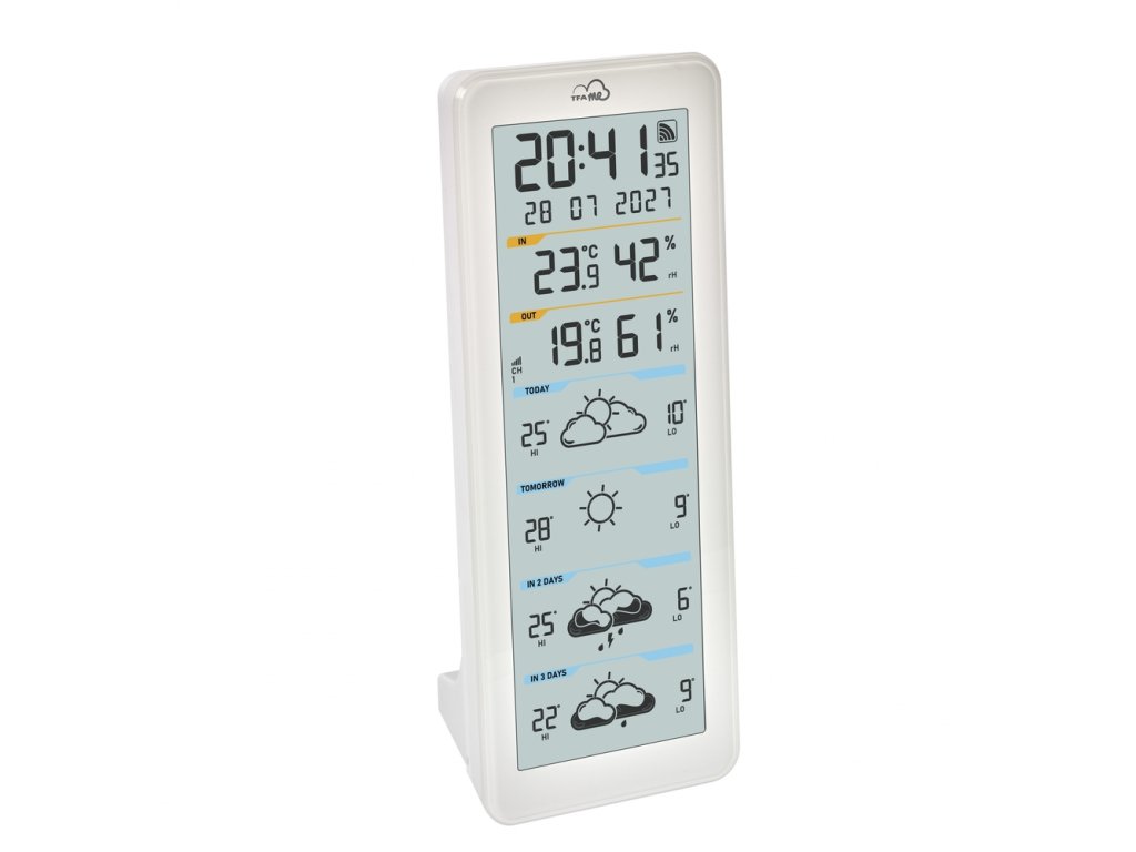 U modelu TFA 35.8108.02 dokáže zobrazit předpověď až na 4 dny (dnes–popozítří). Kromě symbolu se na displeji zobrazuje i předpověď nejvyšší a nejnižší teploty pro daný den. V případě nebezpečí (silný vítr, přívalové deště, ledovka apod.) se na displeji zobrazí varovný symbol. Aby tato předpověď správně fungovala, při spuštění meteostanici připojíte k internetu přes WiFi síť a zadáte její polohu.